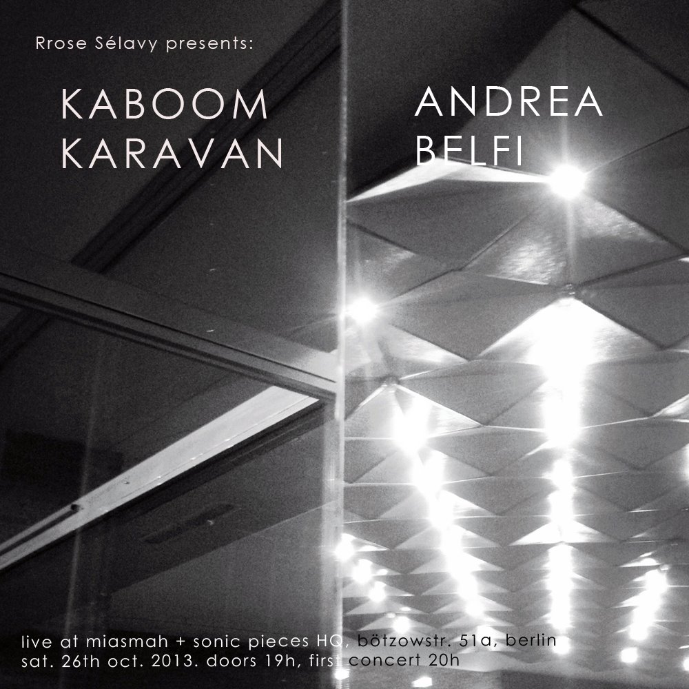 Miasmah and Sonic Pieces continue their house concert series on the 26 of Octobre with Kaboom Karavan & Andrea Belfi. Kaboom Karavan's recent release "Hokus Fokus," as well as the first-ever vinyl pressing of 2007 release "Short Walk With Olaf," both came out on Miasmah this past August.This will also be Kaboom Karavan's first ever Berlin show!